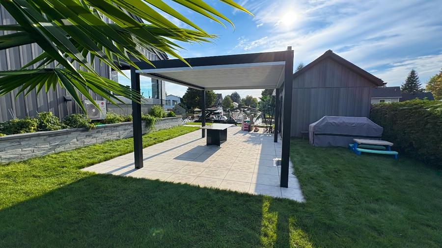 This motorized fixed awning with retractable roof will be perfect above a seating area with garden furniture outside your patio doors. If closed, it will allow you to bask in the sun or, if opened, provide shade when the sun becomes too overbearing.