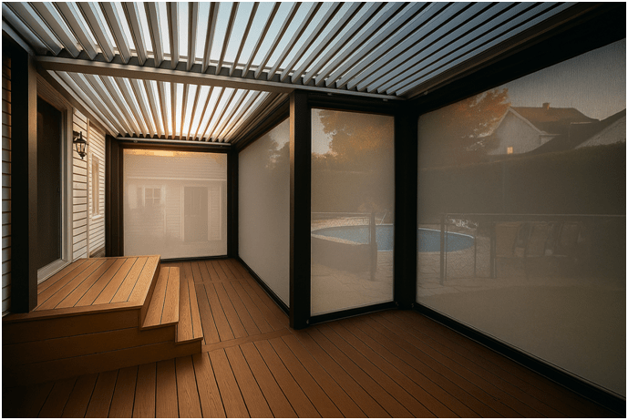 Beaucoup croient encore que les structures extérieures sont utiles seulement en été, mais les nouvelles technologies prouvent le contraire. Au printemps, elles protègent du vent frais tout en laissant passer les premiers rayons réconfortants. En été, elles assurent de l’ombre et de la ventilation naturelle pour éviter la chaleur excessive. À l’automne, elles gardent l’espace chaleureux grâce aux rideaux à la verticale. Nos modèles permettent même d’ajouter un système de moustiquaire intégré au plafond, unique sur le marché, qui améliore encore davantage le confort et la protection