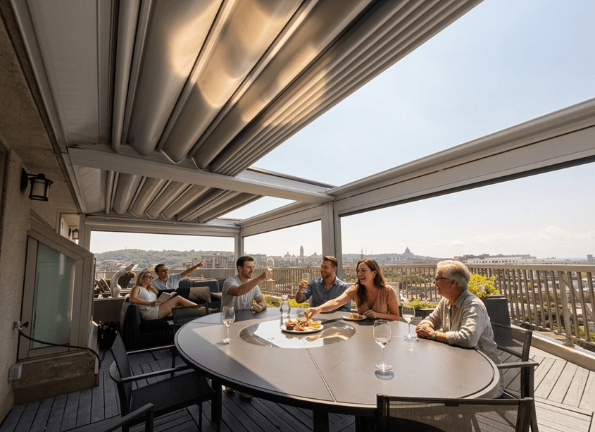 Si vous possédez un appartement sur le toit, l’ajout d’un auvent rétractable peut transformer votre terrasse en un espace extérieur parfait. Un patio surélevé vous offre une belle vue panoramique sur la ville, la forêt ou encore la rivière/lac, selon votre emplacement. Toutefois, l’emplacement sur un toit expose directement votre terrasse aux éléments extérieurs tels que le soleil éclatant, le vent et la pluie.