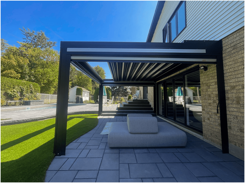 Le grand avantage d’une pergola Ombrasole est sa capacité à s’adapter au climat canadien. Grâce à son fonctionnement motorisé, vous contrôlez la lumière, la pluie et le flux d’air selon vos envies.