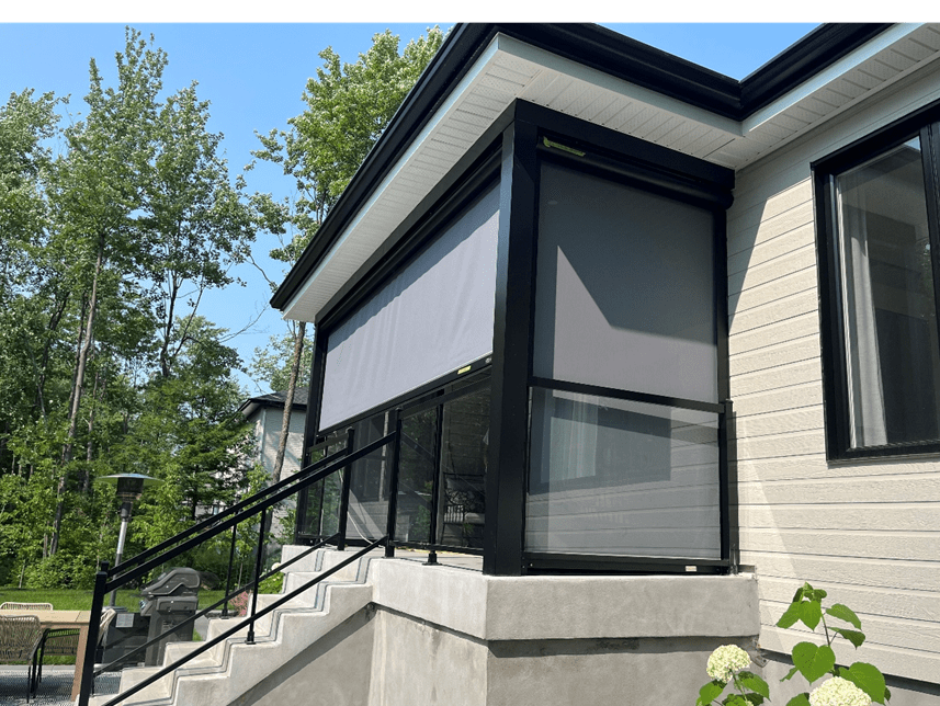 Afin de protéger l’intérieur de votre maison des rayons de soleil qui peuvent nuire à vos meubles et rendre leur couleur fade, la toile de l’auvent fixe rétractable peut s’ouvrir jusqu’à terre, bloquant ainsi le soleil à 100%. Ceci vous fera économiser de l’électricité, car votre climatiseur n’a pas à rester allumé toute la journée pour garder la fraîcheur à l’intérieur de votre maison. Des rideaux et des moustiquaires peuvent également être ajoutés en option.